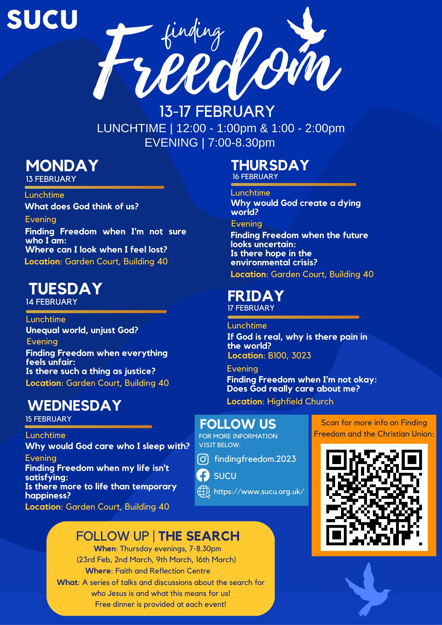 Yes! For four consecutive Thursday evenings (7-8.30pm) starting February 23rd there will be follow-up events in the Faith and Reflection Centre (near Highfield Interchange). There will be talks and discussions to explore who Jesus is and a free dinner will also be provided. Our usual weekly events will also resume after Events Week.